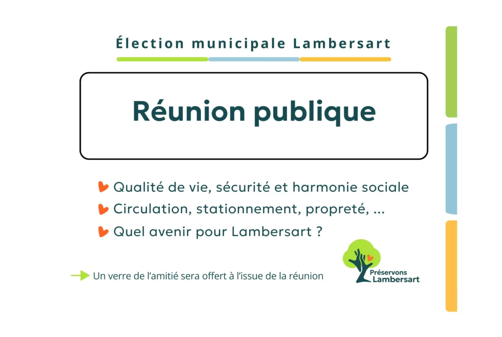 Nos prochaines réunions publiques de quartier Au plus proche des Lambersartois, l’équipe de la liste de Préservons Lambersart vient dans votre quartier pour présenter son programme et vous écouter. Après les 3 premières réunions de quartier dans les quartiers Briqueterie-Verghelles, Cité Familiale et Bourg-Mairie, voici le programme pour les prochaines semaines : 📅 Vendredi 21